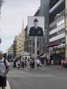 Efter en lille pause gik vi mod Berlinmuren, hvor vi hørte/læste lidt om muren og dens historie/betydning. Derefter gik vi over til Checkpoint Charlie, hvor vi så, passagen igennem muren, fra før i tiden.