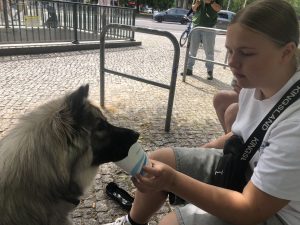 Vi kørte ind forbi Lübben, hvor der lå en å med kajakker og caféer. Der købte vi is og Victoria købte en pickles, inden vi skulle videre.