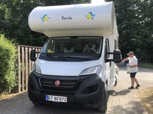 Senere på aftenen, købte vi en plads (stellplatz) ved en campingplads, så vi kunne få tømt toilet-tanken og få fyldt vand på Tumle.